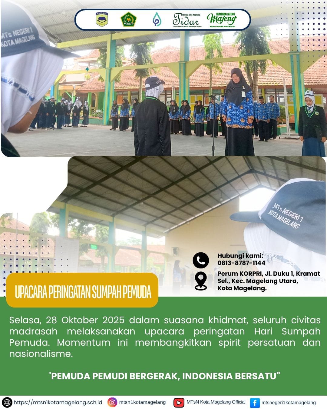 Kota Magelang (Humas) – Dalam rangka memperingati Hari Sumpah Pemuda ke-97 yang bertema “Pemuda Pemudi Bergerak, Indonesia Bersatu”, MTsN Kota Magelang menggelar upacara bendera dengan khidmat di lapangan indoor madrasah yang beralamat di Perum KORPRI, Jl. Duku No. 1, Kelurahan Kramat Selatan, Kecamatan Magelang Utara, Selasa (28/10/2025).