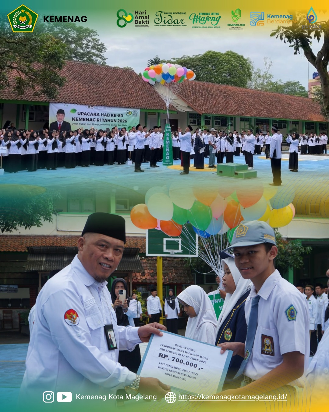 Upacara peringatan HAB ke-80 ini juga dirangkaikan dengan seremoni penyerahan bantuan sosial kepada perwakilan siswa MI, MTs, dan MA, pegawai, serta pemberian penghargaan kepada kepala madrasah inspiratif.