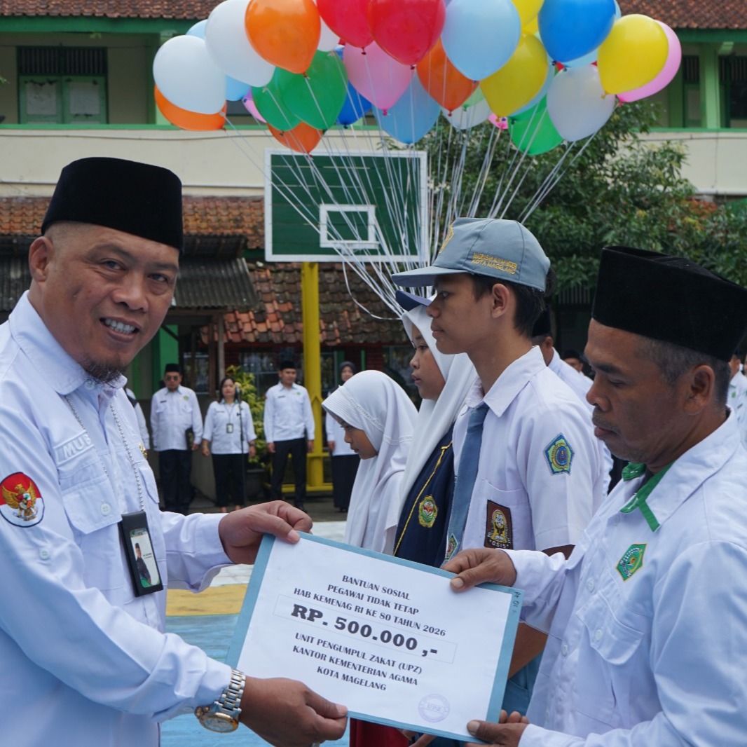 Penyerahan santunan dilaksanakan seusai upacara peringatan HAB ke-80 Kemenag RI Tahun 2026 yang digelar di MTsN 2 Kota Magelang. Upacara berlangsung khidmat dan dipimpin oleh Kepala Kemenag Kota Magelang, HM. Soleh Mubin, yang bertindak sebagai inspektur upacara. Setelah rangkaian upacara selesai, HM. Soleh Mubin secara simbolis menyerahkan santunan kepada para penerima.