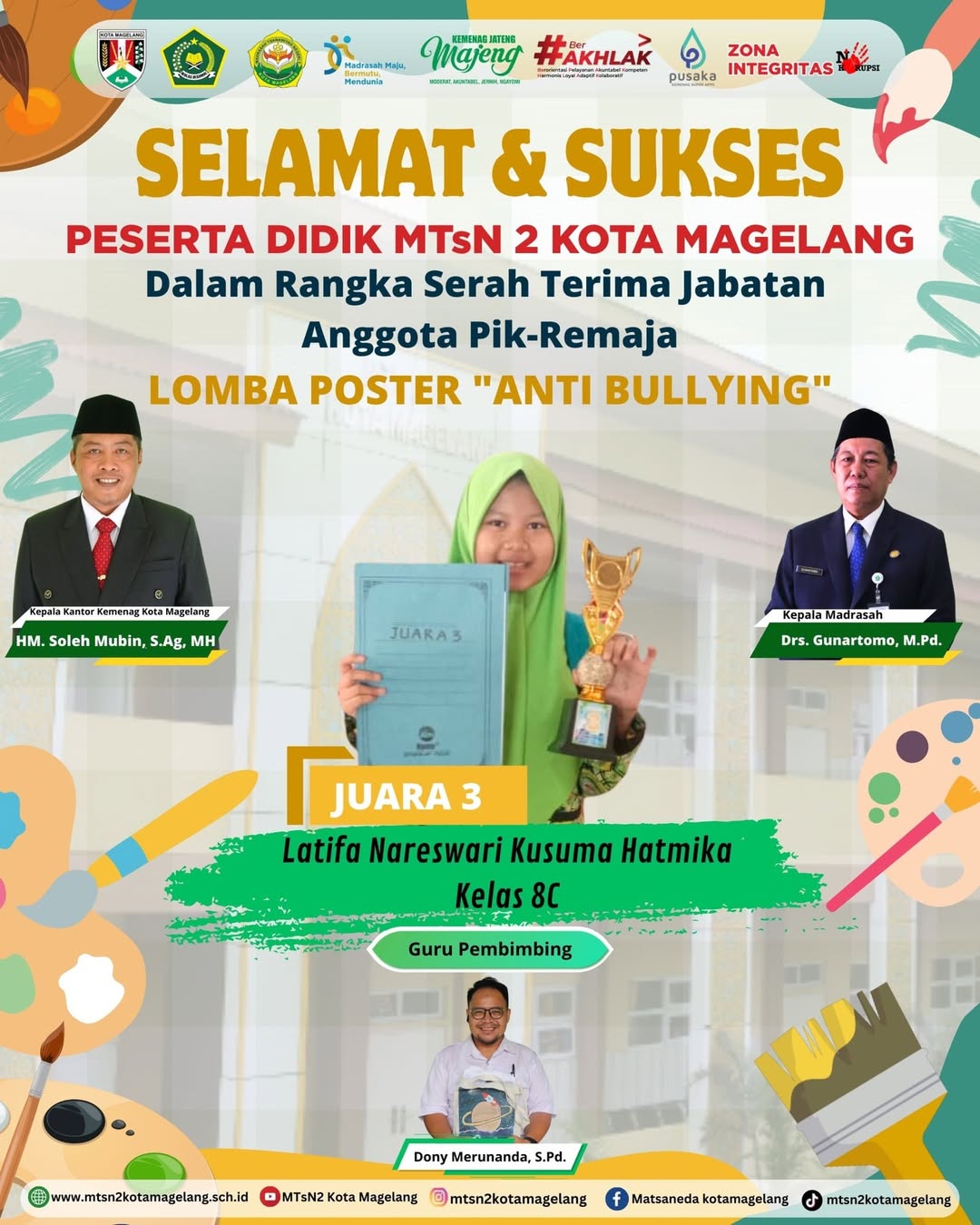 Kota Magelang (Humas) – Ditemui pagi ini diruang kerjanya, Rabu (20/8/2025), Kepala Kantor Kementerian Agama Kota Magelang, HM. Soleh Mubin, memberikan ucapan selamat dan apresiasi kepada Latifa Nareswari Kusuma Hatmika, siswa MTsN 2 Kota Magelang, atas prestasinya meraih Juara 3 Lomba Poster Anti-Bullying (Anti-Perundungan).