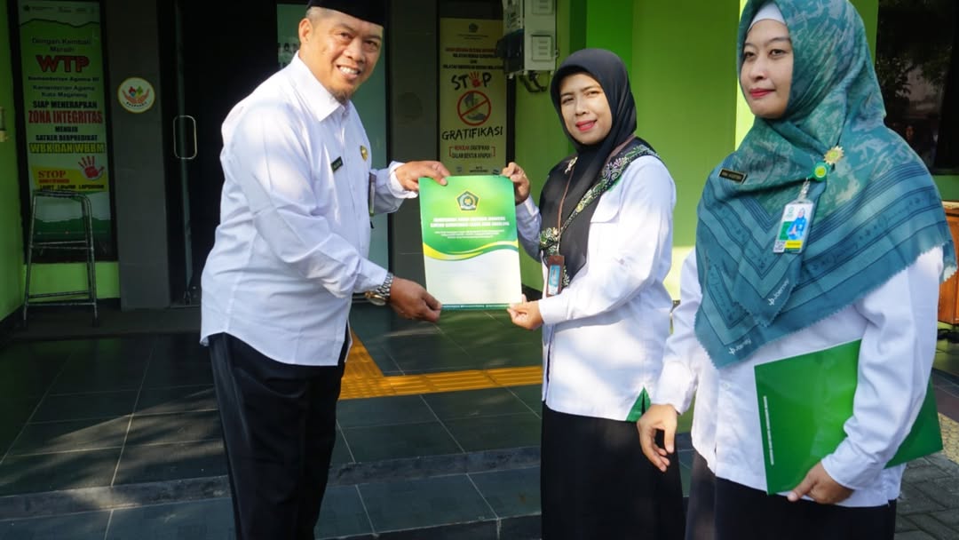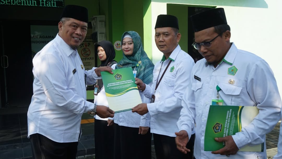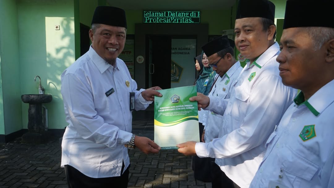 Kota Magelang (Humas) – Kepala Kemenag Kota Magelang, HM. Soleh Mubin, menyerahkan hasil Penilaian Kinerja Kepala Madrasah (PKKM) kepada para kepala madrasah baik negeri maupun swasta jenjang MI, MTs, dan MA. Penyerahan tersebut dilaksanakan dalam apel pagi rutin di halaman kantor, Senin (19/1/2025).