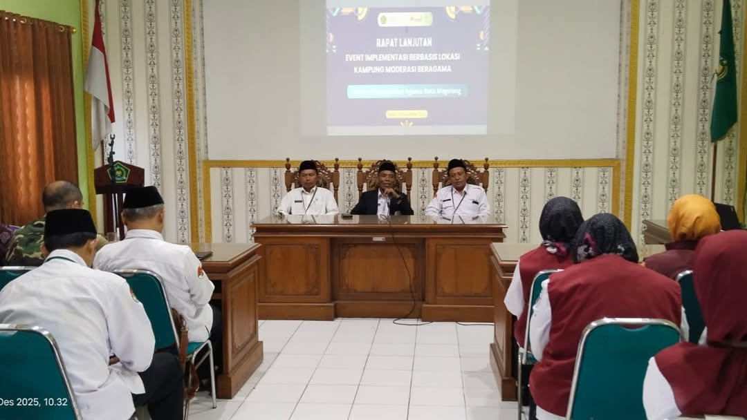 Kota Magelang (Humas) – Seksi Bimas Islam Kantor Kemenag Kota Magelang menggelar kegiatan Implementasi Berbasis Lokasi Kampung Moderasi Beragama di Aula Kantor. Acara ini dihadiri oleh para Kepala KUA Kecamatan, Tim Sadar Kerukunan, Penyuluh Agama, serta perwakilan kelurahan se-Kota Magelang, Selasa (2/12/2025).