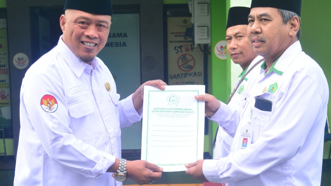 Usai prosesi penghormatan bendera, Kepala Kemenag Kota Magelang HM. Soleh Mubin menyerahkan Surat Keputusan (SK) Pensiun kepada Muhammad Syafa’, guru MAN Kota Magelang yang telah mengabdikan diri selama 30 tahun di dunia pendidikan.