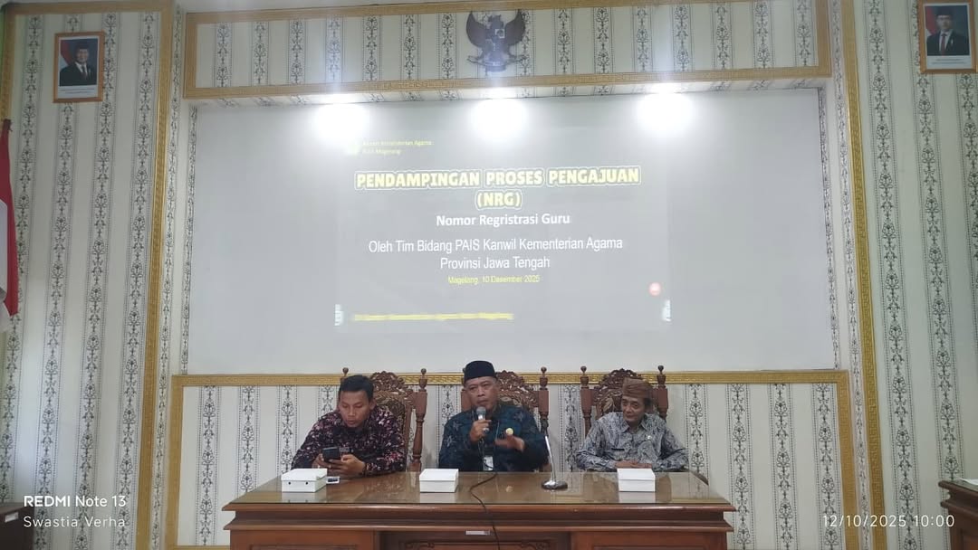 Kota Magelang (Humas) – Kemenag Kota Magelang menyelenggarakan kegiatan Pendampingan Proses Pengajuan Nomor Registrasi Guru (NRG) oleh Tim Bidang PAIS Kanwil Kemenag Provinsi Jawa Tengah, di Aula Kantor, Rabu (10/12/2025).